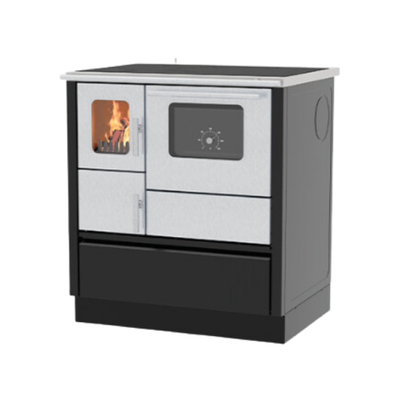 La cuisinière à bois Inox 75 de Alfaplam allie performance, robustesse et design moderne. Avec une puissance de 6 kW et un rendement énergétique de 83 %, elle est capable de chauffer jusqu’à 60m². Conçue pour s’intégrer dans les cuisines contemporaines, cette cuisinière offre une double fonctionnalité : chauffer votre intérieur tout en assurant une cuisson uniforme et précise.