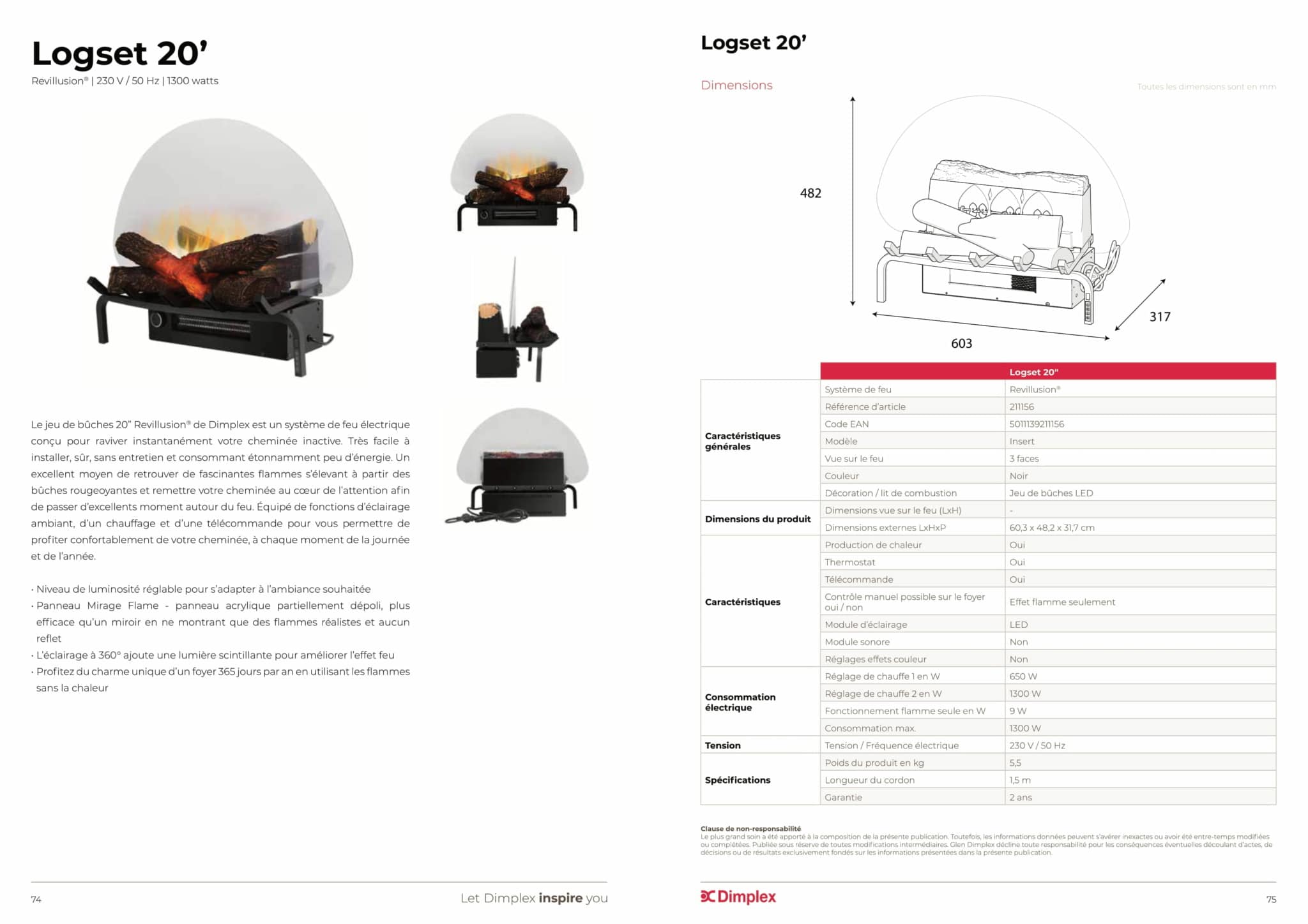 Cet insert électrique mesure 60,3 cm de longueur, 48,2 cm de hauteur et 32 cm de profondeur. Sa taille compacte est idéal pour l’installer dans de petits âtres de cheminée. Télécommandé, l’insert électrique Revillusion 20″ est également pourvu d’un chauffaged’une puissance pouvant aller de 650 à 1 300 watts. Vous avez également la possibilité de régler la luminosité de la flamme. En effet, des commandes sous le lit de braises et sur la télécommande vous permettent plusieurs réglages : chauffage, luminosité, éclairage du foyer…