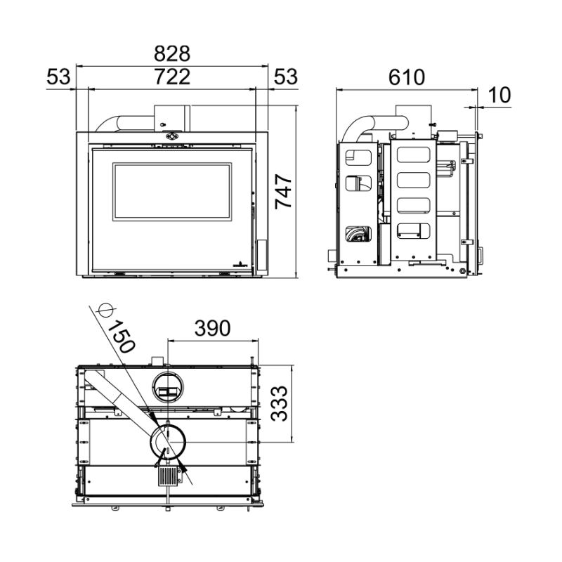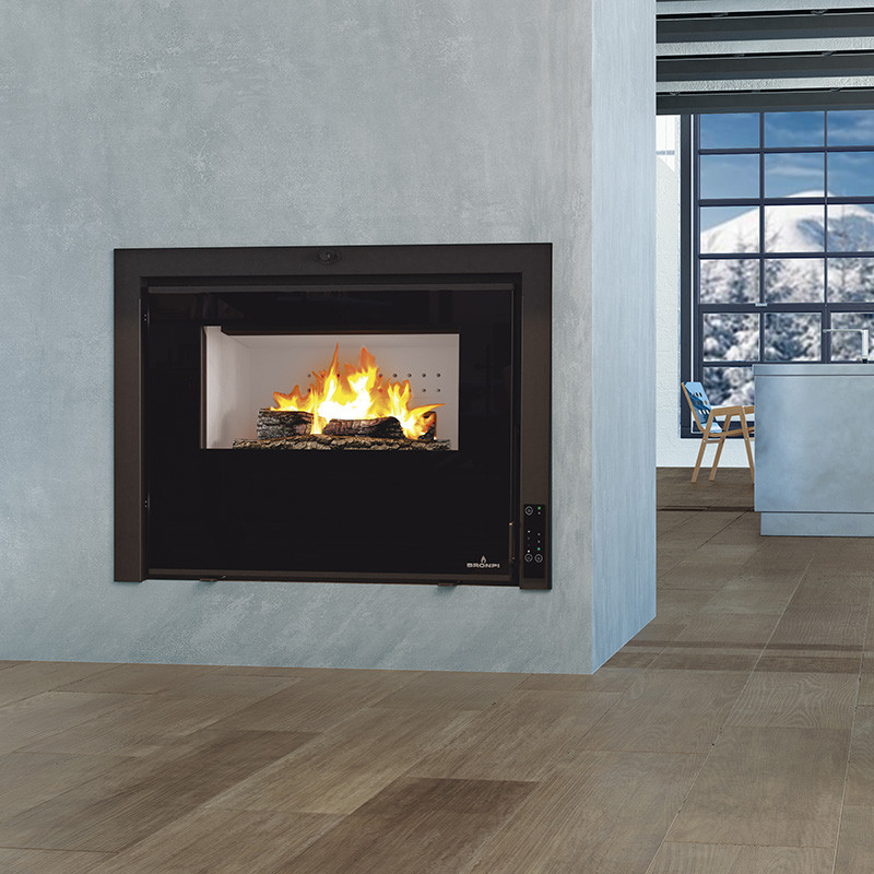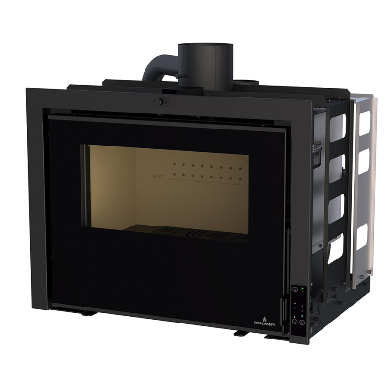 L’Hybrid de Bronpi est doté d’une grande vitre sérigraphiée noire qui offre une vue dégagée sur les flammes tout en résistant aux dépôts de suie. Le système de verre propre maintient la clarté de la vitre pour une vision parfaite du feu. La carte électronique TIEMME et le display 5 touches assurent un contrôle intuitif et précis de l’insert. La ventilation de 400 m³/h garantit une diffusion efficace de la chaleur dans toute la pièce.