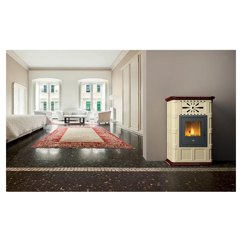 Le poêle à granules ventilé céramique Maria 13.5 kW aux décorations recherchées a une puissance de 13.5kw et chauffe les espaces en leur conférant la touche classique et confortable qu’inspire depuis toujours le revêtement céramique. Ce poêle utilise des granulés de bois comme source d’énergie, ce qui permet de chauffer rapidement et rentablement une pièce. Disposé dans le réservoir à pellets, ce moyen de chauffe permet une combustion plus lente. Grâce à son ventilateur intégré ce poêle diffuse la chaleur de manière homogène pour une meilleure répartition de celle-ci. Cette ventilation permet d’atteindre rapidement la température souhaitée. Ce poêle à granules ventilépermet aussi de diminuer la consommation d’énergie tout en promettant une chaleur durable et confortable. Son revêtement entièrement en céramique permet de garder la chaleur.