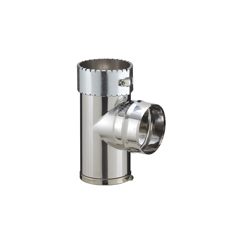 Té venant se fixer à l’extérieur du flexible en partie basse à l’aide d’un collier à griffes. Son Tampon bas démontable facilite les opérations de ramonage.